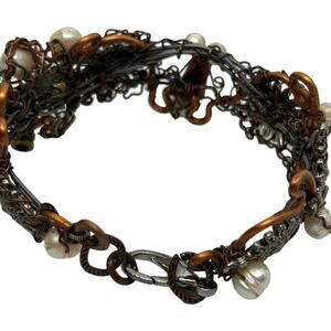 Stunning handmade bracelet featuring intricate filigree metalwork in a dark gunmetal finish, embellished with lustrous white pearl beads. The bracelet combines ornate floral-inspired filigree components with delicate wire wrapping, creating a romantic Victorian-gothic aesthetic. Each section is meticulously connected with copper-toned links, adding subtle warmth to the design.