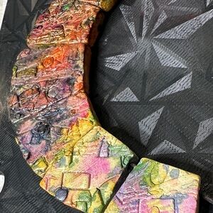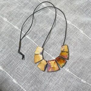 Very unique, handcrafted artisan necklace. Possibly made from wood or a similar material, featuring a segmented design with colorful, abstract patterns. The style suggests it could be a piece of artisanal or statement jewelry.
