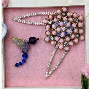 This piece has one of my gold tone hand wired small hummingbird creations (2 in x 2 in). The body is made with Swarovski Crystals in brilliant hues of Royal Purple and Capri Blue Aurora Borealis, 6mm round and 4mm bicone crystals.