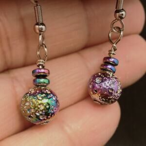 Artisan Iridescent Drop Earrings Electroplated Lava Stone Rainbow Hematite Beads