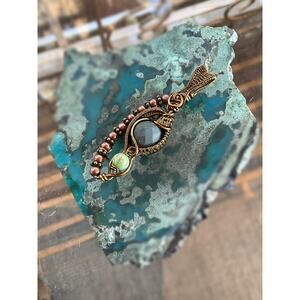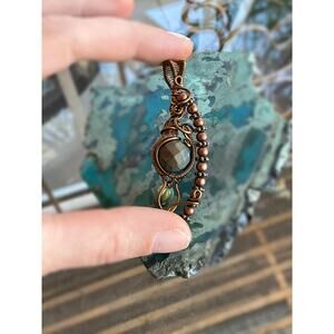 This pendant is made using tarnish resistant vintage bronze wire. The wire is woven intricately through and around the focal. The focal is a faceted cherry creek jasper from Arizona. It shows beautiful earth tones colors of browns and green. The green dangle under the jasper is a Czech glass bead.