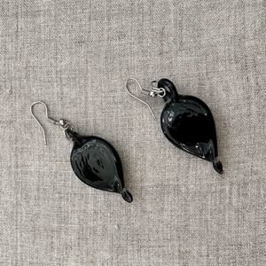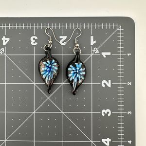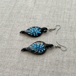 Artisan Lampwork Glass Teardrop Floral Dangle Earrings Black Blue Gold 2"