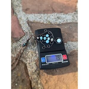 This elegant necklace is truly one of a kind. It has a very organic wire wrapped style and look. The pendant is hand hammered 18 gauge wire. The focal beads down the center are genuine facet Larimar gemstone beads. The beads hanging on the sides are also Larimar. The focal bead at the bottom is a genuine faceted Aquamarine Gemstone. This pendant is very elegant and it would make the perfect birthstone jewelry, or anniversary gift. The bail is made up of copper, and size 8 seed beads.