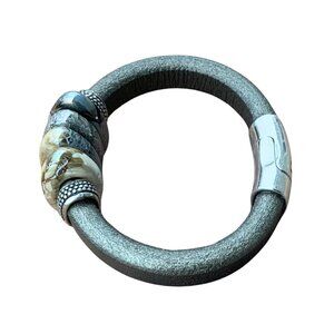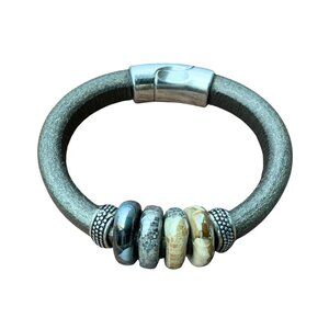 Artisan Leather Cuff Bracelet Ceramic Focal Beads Magnetic Closure
