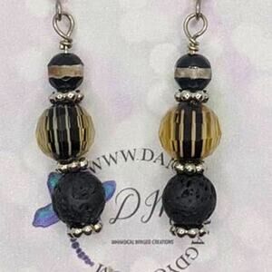 Hand Crafted Striped Glass Earrings Black Lava Beads Diffuser Dangle Yellow Drop