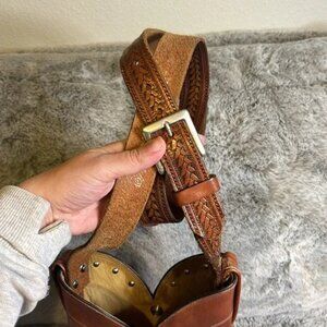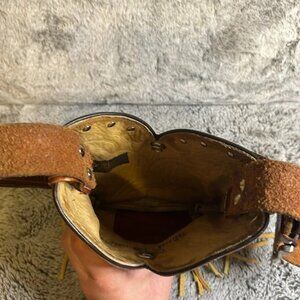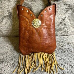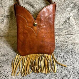 Sturdy leather boot shaft with attached fringe and belt crossbody strap!