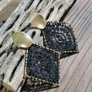 Artisan Matte Gold Black Lace Diamond Rhombus Woven Dangle Earrings