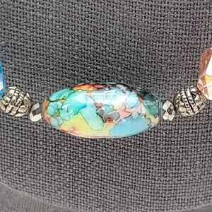 This artisan necklace is a beautiful and unique piece of jewelry. It features a variety of colorful art beads and crystals, creating a stunning and eye-catching design. The necklace is 40 inches long and has no clasp, making it easy to slip on and off.