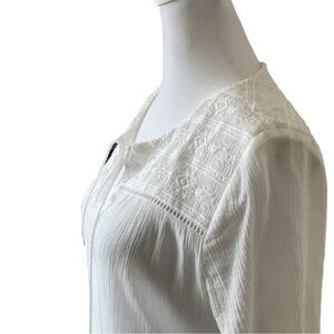 This sweet boho blouse from Artisan NY features an embroidered bodice with tassels, notched v-neckline and 3/4 sleeves with button closure. Care tag still has extra button attached.