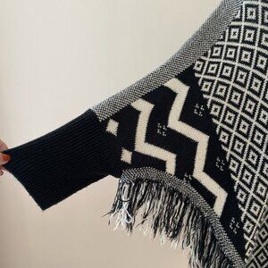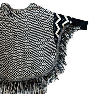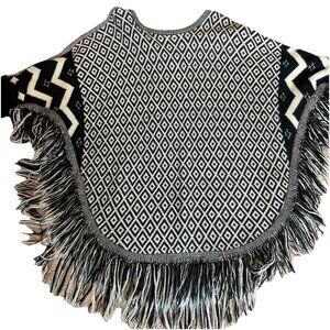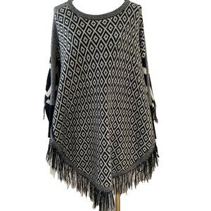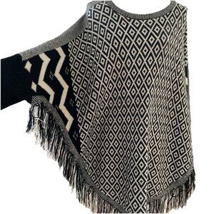 Artisan NY Knit Poncho Cape Sweater Womens 2X Fringe Black Geometric Boho Hippie