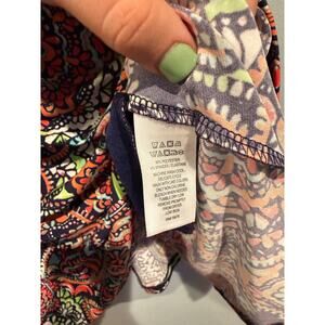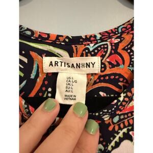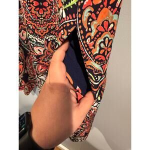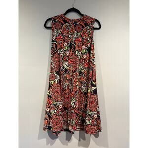 Beautiful and vibrant sleeveless swing dress by Artisan NY. Features a lively paisley floral print in shades of coral, red, navy, white, and hints of green. Made from a soft and stretchy polyester-spandex blend for a comfortable and flattering fit. Convenient side pockets add functionality to this easy, breezy style.