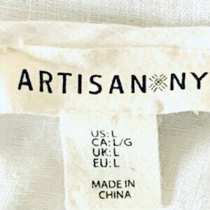 This Artisan NY sleeveless tank top is a perfect addition to your summer or spring wardrobe. The white linen material is lightweight and breathable, making it comfortable for casual occasions. The round neckline and sleeveless design feature a keyhole and tie at the back of the neck, adding a touch of bohemian style. The embroidered border and hem design make this tank top unique and perfect for beach casual or coastal themed events. It comes in size L and is machine washable for easy care.