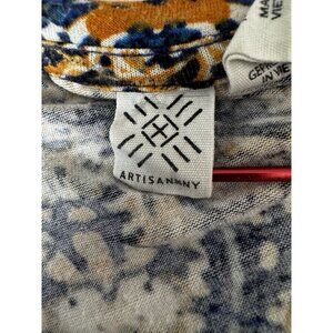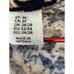 Artisan NY Womens 3X Blue Orange Tunic Top Boho Mandala Print Asymmetrical HemShowcase your free spirit with this Artisan NY Women’s Size 3X Tunic Top, featuring a vibrant blue and orange boho mandala print. The asymmetrical hemline and 3/4 sleeves bring an artistic, relaxed flair, perfect for casual wear or layering with your favorite accessories. Crafted in Vietnam from a soft, stretchy blend of 96% rayon and 4% spandex, this tunic offers both comfort and style. Flat-lay measurements are 24.5 inches pit to pit with a length ranging from 31 to 34 inches, ensuring a flattering fit. In excellent pre-owned condition, this piece is a colorful and versatile addition to any wardrobe.#BohoStyle #PlusSizeFashion #TunicTop #MandalaPrint #Bohemian