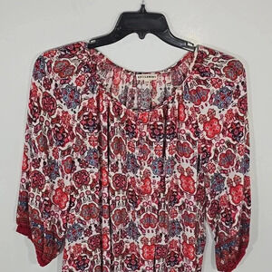 GUC: {Artisan NY} Women's Mosaic Print Rayon Blouse. Beautiful red, blue, pink and white colors. 3/4 Sleeves. Half Button Down Style.