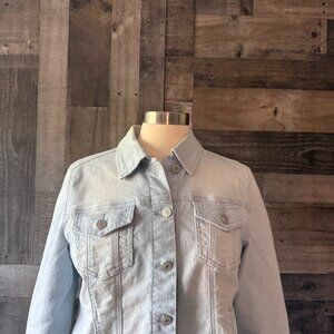 This Artisan NY jean jacket has blue and white stripes with a lighter look at the shoulders, giving the jacket an ombré look. Wear this jacket all year long! It is gently worn and is in excellent condition!