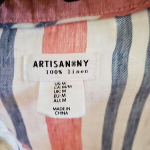 Artisan NY Striped Long Sleeve Linen Top. Super lightweight! 100% linen. Stripes are white, blue, red. Size Medium. Five mother of pearl button closure at neck, Collared Long sleeve; sleeve tabs, high low hem. Excellent preowned condition. Measures approximately 21" chest measuring from underarm to underarm and 32" long measuring from back collar to hem.