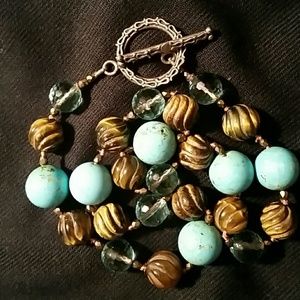 Pretty necklace featuring Turquoise, Moukite Jasper, Crystal and Sterling Silver. Beautiful! Hand knotted. 925 Sterling toggle. From an reputable upscale boutique jeweler, Summit NJ. High quality.