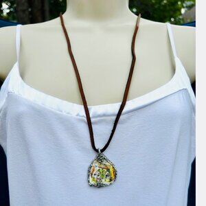 This unique necklace tells a story of heritage and craftsmanship. The pendant, crafted from a Royal Stuart plate, depicts a charming English cottage scene. Encased in intricate boho-metalwork, it hangs elegantly on a leather cord. A piece that seamlessly blends history and contemporary design.