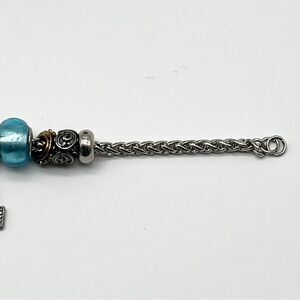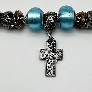 Artisan Ornate Silver Tone Blue Glass Bead Cross Charm Memory Bracelet