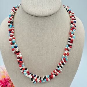 Artisan Pearl Glass Bead Triple Strand Twisted Necklace Box Clasp Red White Blue