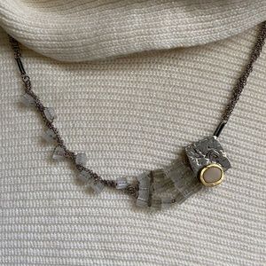 Unique. Never worn, artisan necklace. 26” end-to-end, adjustable. Woven chain seems to be pewter or silver and is dotted with small lucite blocks of a clear/gray color. Weighty. Natural patina. The cream-colored stone rimmed in gold looks lovely on the center piece. One of a kind. This is not a bright, shiny piece. Definitely looks antique/vintage. The last photo depicts the reverse side of the center piece. Beautifully crafted.