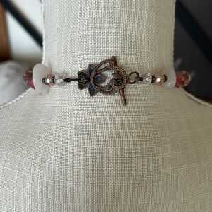 Add a touch of love and craftsmanship to your look with this unique handmade necklace featuring a swirled pink hand-blown glass heart pendant, delicately wire-wrapped in antique bronze tone. The strand is accented with pink glass chips, opalite-style beads, and vintage-style metal details for a soft romantic finish.