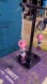 Artisan made earrings featuring pink polymer skulls, oil slick crystal & purple acrylic bead accents on silver plated fishhook ear wire with silver-tone chains.