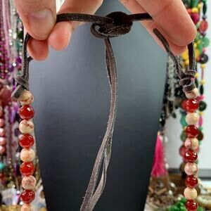 Bold and earthy with a warm, fiery palette—this artisan-crafted necklace features faceted Carnelian beads and natural Red Spiderweb Jasper stones, paired with antique gold-tone accents for a rich, grounding aesthetic. Strung on a soft brown suede cord with an adjustable knot closure for a perfect fit.
