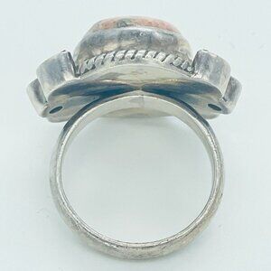 This artisan ring, size 9, features a large natural rhodonite center stone measuring approximately 20 × 15 × 6 mm, bezel set in 925 sterling silver. The rhodonite displays a marbleized pink body with visible areas of silvery matrix along one corner. The main stone is flanked on each side by four bezel-set marquise rhodolite garnets in a deep purple tone with slight red highlights, along with two round moonstones. The moonstones are open-backed to enhance translucency and brightness. All stones are arranged symmetrically in a floral-style layout along the shoulders. The ring weighs approximately 18 g and features a simple half-round shank measuring 4 mm wide. Marked “NK India 925” and attributed to designer Nicky Butler; include “NB” as brand in item specifics. Condition is used with normal silver oxidation. No issues, beautiful!