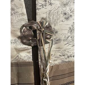 Made by Louise Larsen of vintage kimono and obi silks, dupiono silks, poly lining, Art Nouveau style buckle medallion with Chinese pottery and jade beads. Shoulders 16" bust 20" length 26" Open front