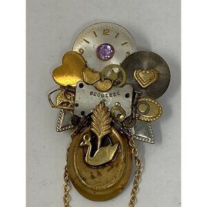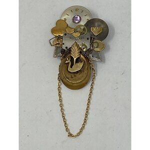 Vintage Artisan Signed Steampunk Brooch With Watch Parts & Rhinestone With Chain dated 1998. Thanks for looking!