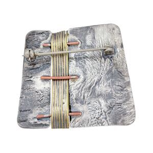 Artisan Mid-Century Modern brooch crafted in sterling silver with mixed metal accents and a deep garnet centerpiece. Bold, sculptural, and collectible — a striking statement piece.