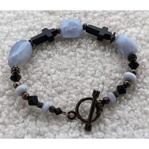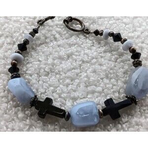 Artisan Sterling Silver Blue Lace Agate & Black Onyx Cross Bracelet 7.5 in