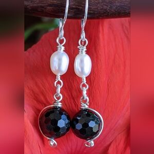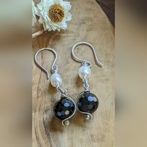 Artisan Sterling Silver Earrings Black Tourmaline And Fresh Water Pearls