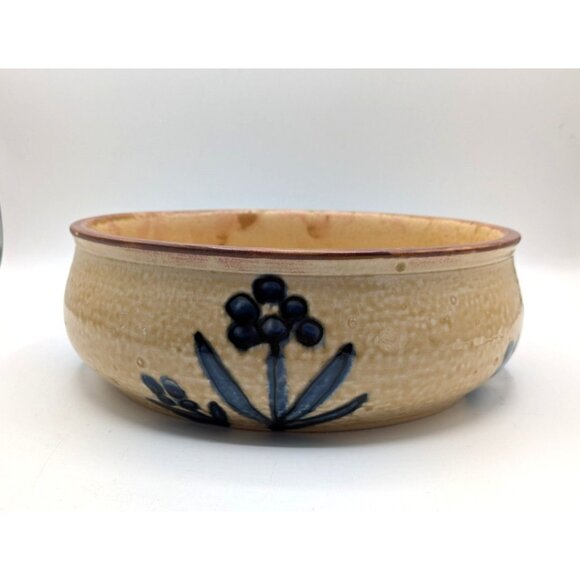 Artisan Stoneware Pottery Centerpiece Serving Bowl Blue Flowers Tan Salt Glaze