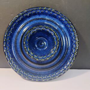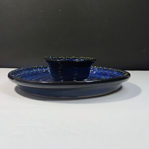 Artisan Studio handmade chip and dip serving plate with rich blue glaze and textured finish. Wheel-thrown with a central dip well, perfect for parties or rustic table settings. Stamped at bottom. Reflects Craftsman style. Estimated late 1990s to early 2000s.