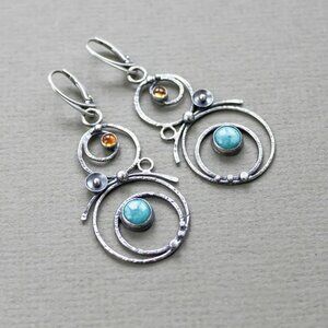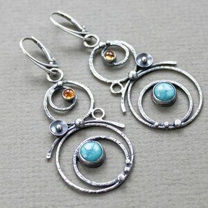 Elegant artisan-style earrings featuring blue gemstone chandeliers with a silver tone finish. These 2-inch earrings are perfect for adding a touch of sophistication to any outfit.