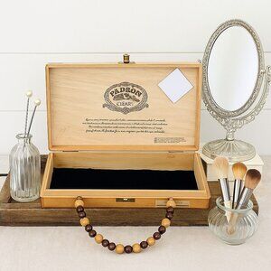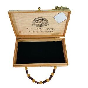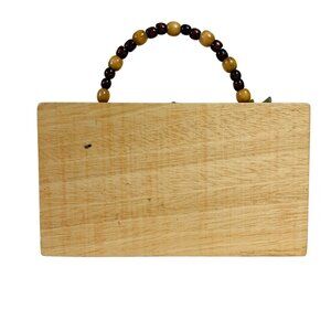 A charming relic of artistry, this wooden cigar handbag whispers tales of distant lands through its postcard-themed facade. Its beaded handle adds rustic elegance, while a sunlit flower blooms with timeless grace. A treasure chest for your essentials, it's a harmonious blend of nostalgia and function, inviting adventure with every carry.
