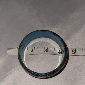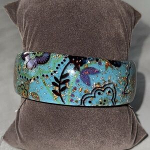 Elevate your style with this stunning artisan bangle bracelet. The gold flecks are inside the clear lucite. Featuring a vibrant teal base with intricate gold accents, this accessory adds a touch of elegance to any outfit. Perfect for any occasion. 3” diameter and 1” wide. Excellent pre-loved condition.