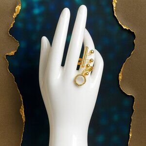 Make a bold statement with this one-of-a-kind artisan Turkish cocktail ring! Handcrafted with exquisite attention to detail, this adjustable ring is plated in luxurious 18K gold for a radiant, long-lasting shine. Its modern geometric design features flowing lines, golden spheres, and a luminous glass pearl centerpiece that captures the light beautifully. Perfect for cocktail parties, holidays, weddings, or elevating your everyday style, this ring embodies contemporary elegance with a touch of boho flair.
