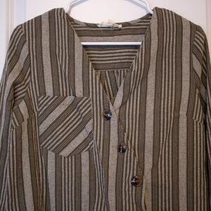 Greenish Brownish Lagenlook Boho Striped Button Up Top Asymmetrical Pocket Artsy VTG Style M Entro
