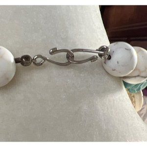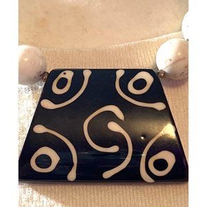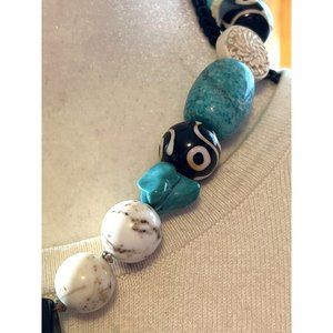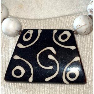 Artisan Wood & Ceramic Bead Necklace -- 18". This necklace includes White Turquoise, Blue Howlite, Carved Wood Beads, plastic pendant, and shepherd hook closure. Necklace is in excellent pre-loved condition. Measurements: Length: 18"; Pendant: 2"x2".