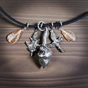 Immerse yourself in the raw beauty of nature with this meticulously handcrafted pendant. Each element tells a story of organic transformation, capturing the delicate essence of woodland treasures through intricate silver casting and golden glass leaf accents.