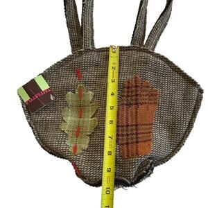 • Color: Brown tweed with multicolor appliqué (plaid gloves + tree motif)
