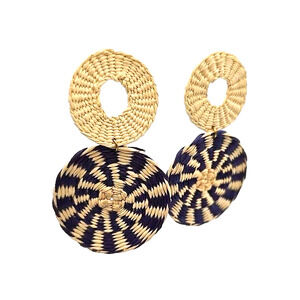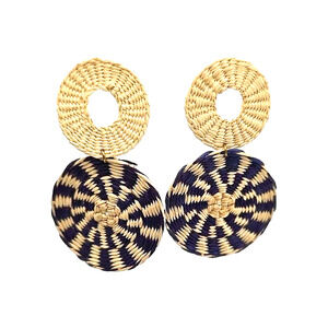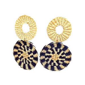 Artisan Woven Straw Earrings Dangle Pierced Circular Design Beige Purple Blue