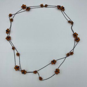 Artisan one of a kind necklace. Flowers are formed using amber beads with a garnet bead as the center. Composition of the dark metal chain is unknown. 1980's. Measures 60" long. No clasp. Can be wrapped twice or three times around. Let me know if you have any questions, I'm happy to help.