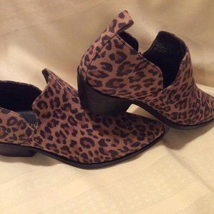 Stylish Suede-Leather leopard print ankle boots; easy to slip-on; 1 3/4" height chunky & stable heel; rubber soles=totally comfortable, chic & F-U-N. NWT. Size 6M