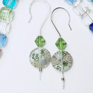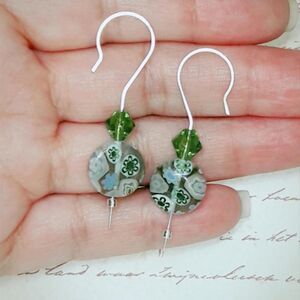 Murano glass millefiori & green pressed glass beads. The beauty of individually hand crafted glass, lampwork, very intricate & Artisan special. Embrace your inner bohemian with our colorful pieces! #FashionInspo #BohemianEarrings #ColorfulEarrings
