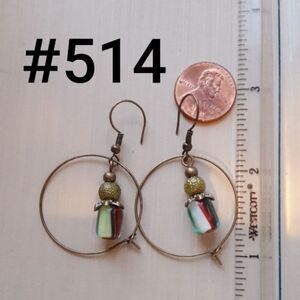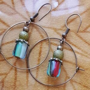 ● Metal/Color: Antique.Bronze Boho tri color glass dangle on hook setting and a pair of bronze fininsh hoops. Wear layered or separate. Hooks Hypoallergenic No nickel/lead No returns