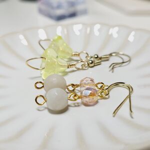 Flower drop Czech glass on 925 stamp hook and 2nd pair Petite Crystal and Amazonite gemstone drops on plated alloy hypoallergenic hooks Join the movement of conscious Upcycling today! #SlowFashion #HandcraftedEarrings #SupportLocalArtists